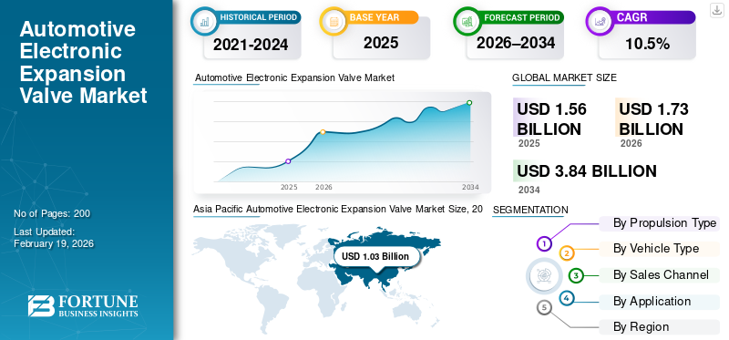 The global automotive electronic expansion valve market size was valued at USD 1.56 billion in 2025. The market is projected to grow from USD 1.73 billion in 2026 to USD 3.84 billion by 2034, exhibiting a CAGR of 10.5% during the forecast period.