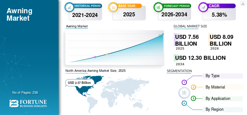 The global awning market size was valued at USD 7.56 billion in 2025. The market is projected to grow from USD 8.09 billion in 2026 to USD 12.30 billion by 2034, exhibiting a CAGR of 5.38% during the forecast period. North America dominated the global awning market with a market share of 33.99% in 2025.
