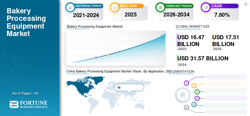The global bakery processing equipment market size was valued at USD 16.47 billion in 2025 and is projected to grow from USD 17.51 billion in 2026 and reach USD 31.57 billion by 2034, exhibiting a CAGR of 7.60% during the forecast period. Asia Pacific region dominated the market with a share of 34.90% in 2025. The industry's growth is mainly attributed to the rising demand for ready-to-eat bakery products and technological advancements like automation, IoT, and AI, improving efficiency and reducing operational costs.