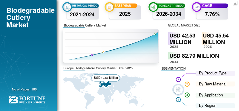 The global biodegradable cutlery market size was valued at USD 42.53 million in 2025 and is projected to grow from USD 45.54 million in 2026 to USD 82.79 million by 2034, registering a CAGR of 7.76% over the forecast period. Europe dominated the biodegradable cutlery market with a market share of 29.79% in 2025. Moreover, the biodegradable cutlery market in the U.S. is expected to grow significantly, reaching USD 8 million by 2032. This growth is driven by increasing environmental concerns, government regulations on plastic use, and rising consumer preference for sustainable dining solutions.