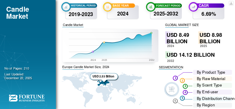 The global candle market size was valued at USD 8.49 billion in 2024. The market is projected to grow from USD 8.98 billion in 2025 to USD 14.12 billion by 2032, exhibiting a CAGR of 6.69% during the forecast period.