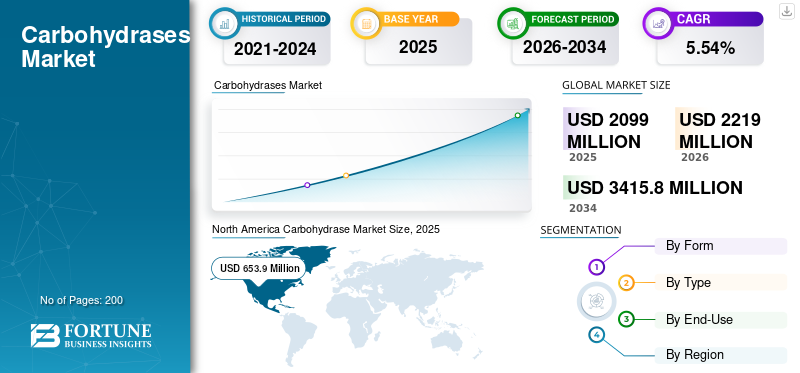 The global carbohydrase market size was valued at USD 2,099.0 million in 2025. The market is projected to grow from USD 2,219.0 million in 2026 to USD 3,415.8 million by 2034, exhibiting a CAGR of 5.54% during the forecast period. North America dominated the global carbohydrase market with a market share of 31.15% in 2025.