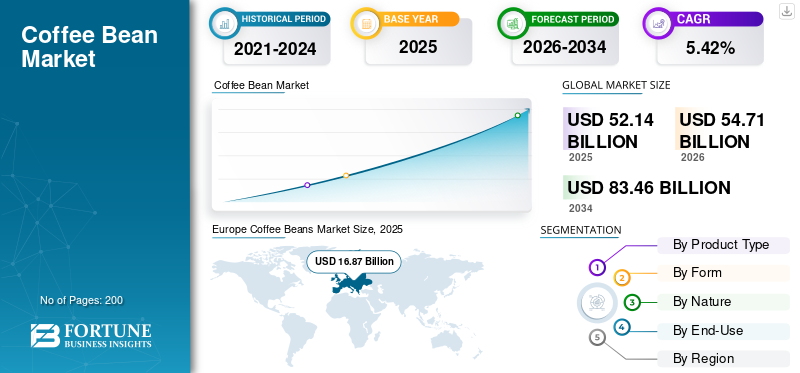 The global coffee beans market size was valued at USD 52.14 billion in 2025. The market is projected to grow from USD 54.71 billion in 2026 to USD 83.46 billion by 2034, exhibiting a CAGR of 5.42% during the forecast period. Europe dominated the coffee beans market with a market share of 32.36% in 2025.