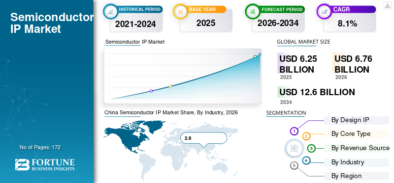 Die Größe des globalen Halbleiter-IP-Marktes wurde im Jahr 2025 auf 6,25 Milliarden US-Dollar geschätzt und wird voraussichtlich von 6,76 Milliarden US-Dollar im Jahr 2026 auf 12,60 Milliarden US-Dollar im Jahr 2034 ansteigen, was einer durchschnittlichen jährlichen Wachstumsrate von 8,10 % zwischen 2026 und 2034 entspricht. Der asiatisch-pazifische Raum dominierte den Halbleiter-IP-Markt mit einem Marktanteil von 52,63 % im Jahr 2025. Steigende Anforderungen an die Automatisierung und zunehmende Akzeptanz der IP-Core-Produkte im Unterhaltungselektronikindustriein einem schnellen Tempo unterstützt das Marktwachstum. Darüber hinaus wächst die Branche aufgrund der zunehmenden Internetdurchdringung schnell und die zunehmende Akzeptanz intelligenter vernetzter Geräte trägt zum Marktwachstum bei.