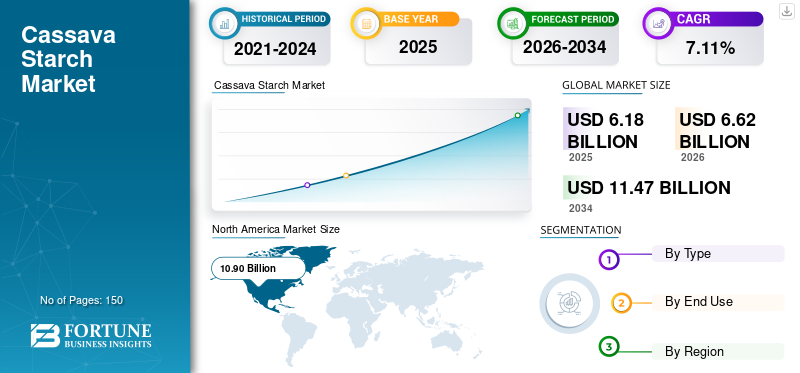 Die globale Marktgröße für Maniokstärke wurde im Jahr 2025 auf 6,18 Milliarden US-Dollar geschätzt. Es wird erwartet, dass der Markt von 6,62 Milliarden US-Dollar im Jahr 2026 auf 11,47 Milliarden US-Dollar im Jahr 2034 wächst und im Prognosezeitraum eine jährliche Wachstumsrate von 7,11 % aufweist. Nordamerika dominierte den Maniokstärkemarkt mit einem Marktanteil von 27,02 % im Jahr 2025.