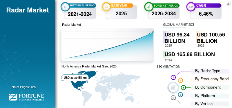 Die Größe des globalen Radarmarktes wurde im Jahr 2025 auf 96,34 Milliarden US-Dollar geschätzt. Es wird erwartet, dass der Markt von 100,56 Milliarden US-Dollar im Jahr 2026 auf 165,88 Milliarden US-Dollar im Jahr 2034 wächst und im Prognosezeitraum eine jährliche Wachstumsrate von 6,46 % aufweist.