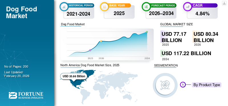 The global dog food market size was valued at USD 77.17 billion in 2025. The market is projected to grow from USD 80.34 billion in 2026 to USD 117.22 billion by 2034, exhibiting a CAGR of 4.84% during the forecast period.