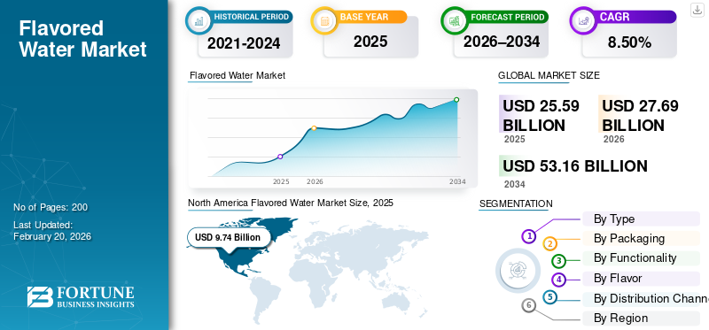 The global flavored water market size was valued at USD 25.59 billion in 2025. The market is projected to grow from USD 27.69 billion in 2026 to USD 53.16 billion by 2034, exhibiting a compound annual growth rate CAGR of 8.50% during the forecast period.