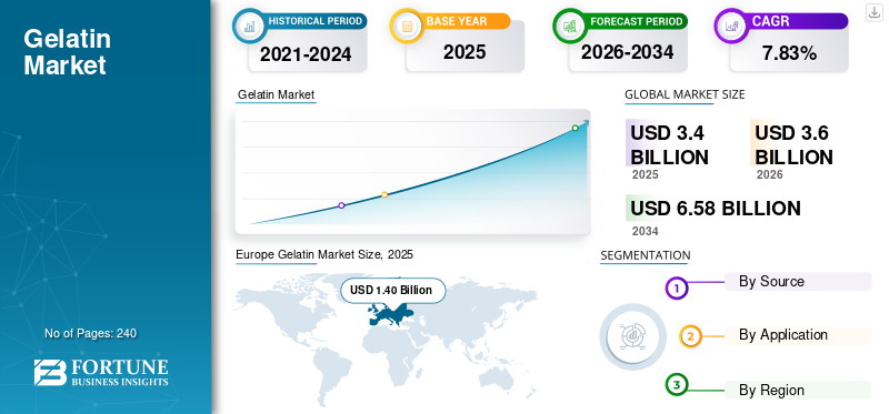 According to Fortune Business Insights, the global gelatin market size was valued at USD 3.40 billion in 2025 and is projected to grow from USD 3.60 billion in 2026 to USD 6.58 billion by 2034