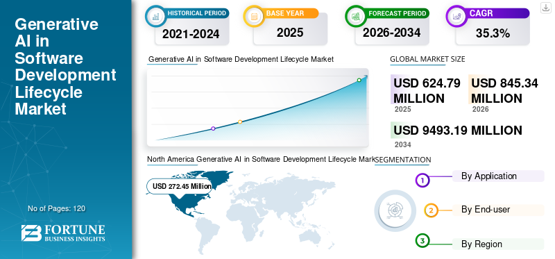 The global generative ai in software development lifecycle market size was estimated at USD 624.79 million in 2025. The market is expected to rise from USD 845.34 million in 2026 to USD 9493.19 million by 2034, expanding at a CAGR of 35.30% from 2026 to 2034. North America dominated the generative ai in software development lifecycle market with a market share of 43.61% in 2025.
