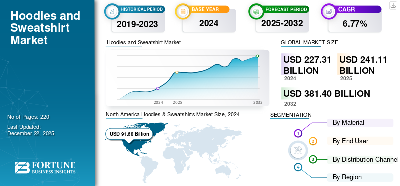 The global hoodies & sweatshirts market size was valued at USD 227.31 billion in 2024. The market is expected to grow from USD 241.11 billion in 2025 to USD 381.40 billion by 2032, exhibiting a CAGR of 6.77% during the forecast period.