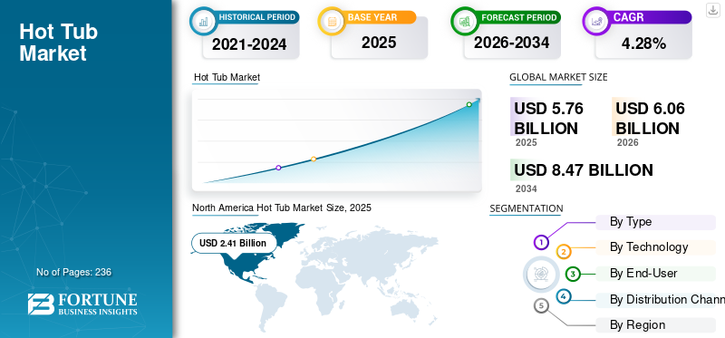 The global hot tub market size was valued at USD 5.76 billion in 2025. The market is projected to grow from USD 6.06 billion in 2026 to USD 8.47 billion by 2034, exhibiting a CAGR of 4.28% during the forecast period. North America dominated the global market with a market share of 41.84% in 2025.