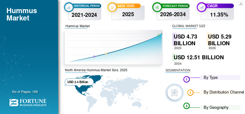 According to Fortune Business Insights, the global hummus market size was USD 4.73 billion in 2025 and is projected to grow from USD 5.29 billion in 2026 to USD 12.51 billion by 2034, registering a CAGR of 11.35% during the forecast period.
