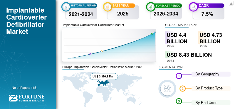 The global implantable cardioverter defibrillator market size was valued at USD 4.40 billion in 2025. The market is projected to grow from USD 4.73 billion in 2026 to USD 8.43 billion by 2034, exhibiting a CAGR of 6.40% during the forecast period. Europe dominated the implantable cardioverter defibrillator market with a market share of 50.52% in 2025. An implantable cardioverter-defibrillator is an implantable electronic device which is effective for the treatment of sudden cardiac arrest as well as for arrhythmia. The device can be programmed to detect an abnormal heart rate and to deliver electric shocks as per requirement.