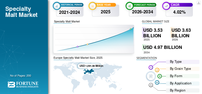 Specialty Malt Market Size, Share & Industry Analysis, By Type (Caramel/Crystal Malt, Roasted Malt, Dark Malt, and Others), By Form (Dry and Liquid), By Grain Type (Barley, Wheat, Rye, Oats, and Others), By Application (Brewing, Distilling, Non-alcoholic Malt Beverages, Baking, Dairy & Frozen Products, and Others), and Regional Forecast, 2026–2034