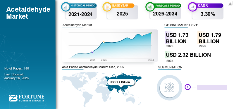 世界のアセトアルデヒド市場規模は2025年に17億3000万米ドルと評価され、2026年の17億9000万米ドルから2034年までに23億2000万米ドルへ成長し、予測期間中に年平均成長率(CAGR)3.30%を示すと予測されている。アジア太平洋地域は2025年に69.30%の市場シェアを占め、アセトアルデヒド市場を支配した。さらに、米国におけるアセトアルデヒド市場規模は、食品・飲料、製薬、塗料産業からのアセトアルデヒド及びその誘導体に対する需要増加に牽引され、2032年までに推定2億5008万米ドルに達すると予測される。
