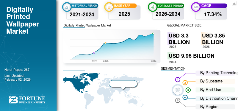 デジタル印刷壁紙市場規模、シェアおよび業界分析、印刷技術別(射出および電子写真)、基材別(不織布、ビニール、紙、その他)、最終用途別(住宅、小売およびブティック、自動車および交通、企業オフィスおよびコワーキングスペースなど)、流通チャネル別(B2B/契約チャネル、専門店、オンライン小売など)、および地域予測、 2026~2034年