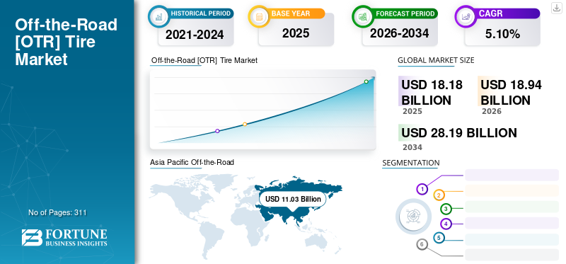 世界のオフ・ザ・ロード(OTR)タイヤ市場規模は、2025年に181億8,000万米ドルと評価されました。同市場は、2026年の189億4,000万米ドルから2034年には281億9,000万米ドルへと成長すると予測されており、予測期間中の年平均成長率(CAGR)は5.10%と見込まれています。2025年には、アジア太平洋地域が60.70%の市場シェアを占め、世界市場を主導しました。さらに、米国のオフ・ザ・ロード(OTR)タイヤ市場は今後大幅な成長が期待されており、2032年までに市場規模は約26億4,000万米ドルに達すると予測されています。