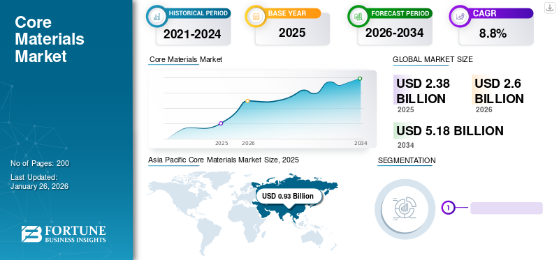 世界のコア材料市場規模は2025年に23億8,000万米ドルと評価され、2026年の26億米ドルから2034年までに51億8,000万米ドルへ成長し、予測期間中に8.8%のCAGRを示すと予測されている。アジア太平洋地域は2025年に39.00%の市場シェアでコア材料市場を支配した。さらに、米国におけるコア材料市場規模は、航空宇宙産業の成長に牽引され、2032年までに推定9億9,060万米ドルに達すると予測されている。この製品は、高強度、優れた柔軟性、最小限のメンテナンス、レーダー透過性、低熱伝導性といった独自の特性から、航空機、無人航空機(UAV)、飛行船などで広く利用されているためである。