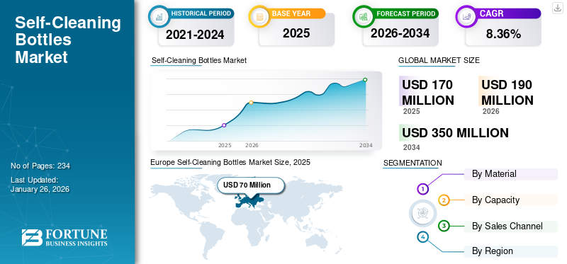 世界のセルフクリーニングボトル市場規模は、2025年に170百万米ドルと評価されました。市場は、予測期間中に年平均成長率(CAGR)8.36%を示し、2026年の190百万米ドルから2034年には350百万米ドルに成長すると予測されています。ヨーロッパは、2025年に40.33%の市場シェアを占め、セルフクリーニングボトル市場を支配しました。