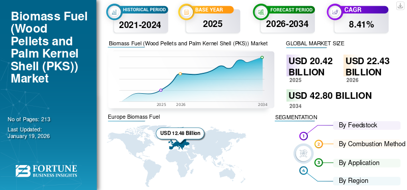 世界のバイオマス燃料(木質ペレットおよびパーム核殻(PKS))市場規模は、2025年に204億2,000万米ドルと評価された。市場は2026年の224億3,000万米ドルから成長し、2034年までに428億米ドルに達すると予測されており、予測期間中に年平均成長率(CAGR)8.41%を示す見込みである。