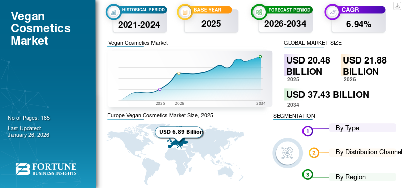 世界のビーガン化粧品市場規模は、2026年の218億8,000万米ドルから2034年には374億3,000万米ドルに成長すると予測されており、予測期間中の年平均成長率(CAGR)は6.94%です。