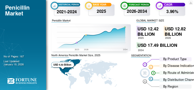 世界のペニシリン市場規模は2025年に124億2000万米ドルと評価され、2026年の128億2000万米ドルから2034年までに174億9000万米ドルに成長し、予測期間中に3.96%のCAGRを示すと予測されています。北米は2025年に36.45%の市場シェアでペニシリン市場を支配した。