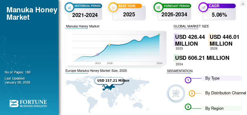 マヌカハニー市場規模は2025年に4億2644万米ドルと評価された。市場は2026年の4億4601万米ドルから2034年までに6億621万米ドルへ成長し、2026年から2034年の予測期間において年平均成長率(CAGR)5.06%を示すと予測されている。欧州は2025年に36.87%の市場シェアを占め、マヌカハニー市場を支配した。