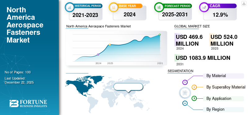 北米航空宇宙用ファスナー市場規模は2024年に4億6,960万米ドルと評価された。市場は2025年の5億2,400万米ドルから2031年までに10億8,390万米ドルへ成長し、予測期間中に年平均成長率(CAGR)12.9%を示すと予測されている。