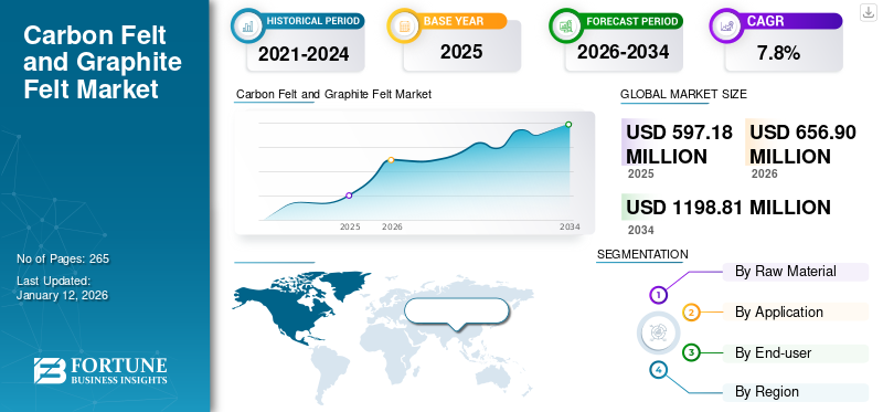 世界のカーボンフェルトおよびグラファイトフェルト市場規模は、2025年に5億9718万米ドルと評価され、2026年の6億5690万米ドルから2034年までに11億9881万米ドルへ成長し、予測期間中に年平均成長率(CAGR)7.8%を示すと予測されている。アジア太平洋地域は2025年に57%のシェアで世界市場を支配した。
