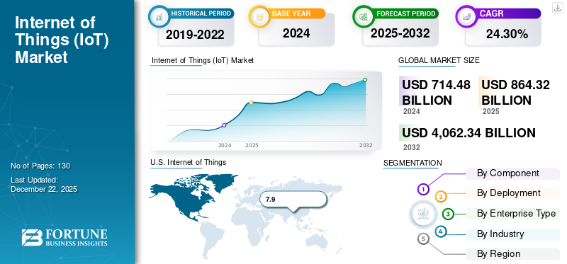 世界のモノのインターネット(IoT)市場規模は、2025年に8,643億2,000万米ドルと評価された。市場は2026年の1兆550億2,000万米ドルから2034年までに5兆5,524億8,000万米ドルへ成長し、予測期間中に23.10%の年平均成長率(CAGR)を示すと予測されている。北米は2025年に32.40%の市場シェアを占め、モノのインターネット(IoT)市場を支配した。