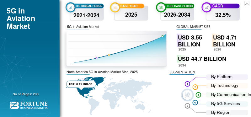 Fortune Business Insightsの報告によると、世界の航空分野における5G市場は2026年に47億1,000万米ドルであり、2034年までに447億米ドルに達すると予測されており、2026年から2034年の予測期間において年平均成長率(CAGR)32.5%を示すと見込まれている。