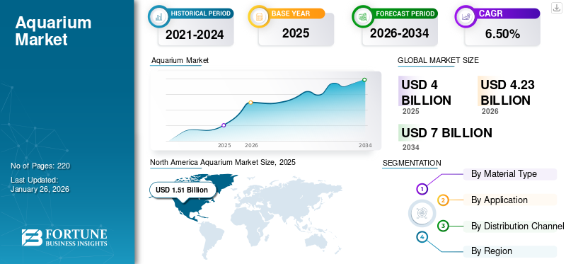 フォーチュン・ビジネス・インサイトズによると、世界の水槽市場は2025年に40億米ドルと評価され、2026年の42億3000万米ドルから2034年までに70億米ドルへ成長すると予測されている。