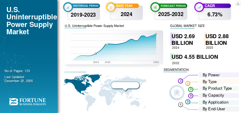 米国の無停電電源装置(UPS)市場規模は、2024年に26億9,000万米ドルと評価されました。市場は2025年の28億8,000万米ドルから2032年までに45億5,000万米ドルに成長すると予測されており、予測期間中の年平均成長率(CAGR)は6.73%となる見込みです。