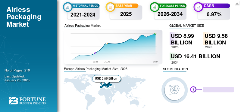 フォーチュン・ビジネス・インサイトによると、世界のエアレス包装市場は2026年に95億8,000万米ドルと評価され、2034年までに164億1,000万米ドルに達すると予測されている。2026年から2034年にかけて年平均成長率(CAGR)6.97%で成長する見込みである。