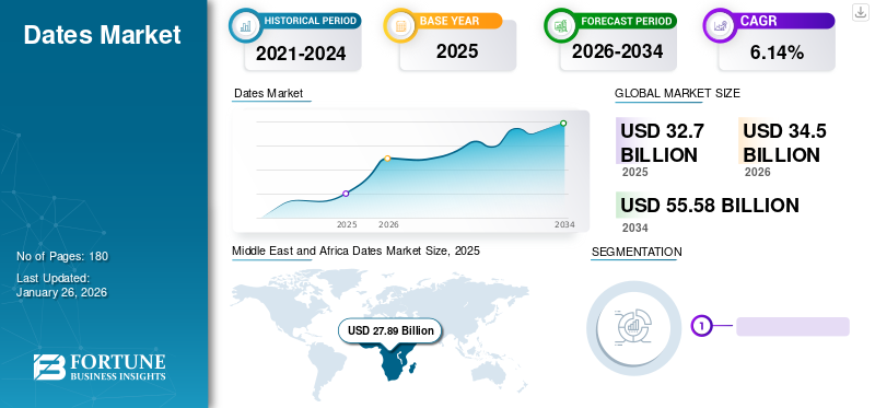 世界のナツメヤシ市場規模は2025年に327億米ドルと評価され、2026年の345億米ドルから2034年までに555億8000万米ドルへ成長し、予測期間中に年平均成長率(CAGR)6.14%を示すと予測されている。中東・アフリカ地域は2025年に85.28%の市場シェアを占め、ナツメヤシ市場を支配した。さらに、特定のドライフルーツの健康効果に関する消費者意識の高まりを背景に、米国におけるナツメヤシ市場規模は大幅に拡大し、2032年までに推定11億6000万米ドルに達すると予測されている。