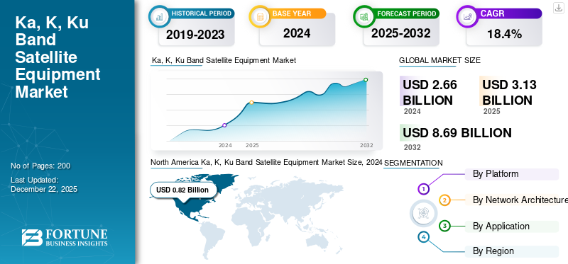 世界のKa、K、Kuバンド衛星機器市場規模は、2024年に26億6,000万米ドルと評価された。市場は2025年の31億3,000万米ドルから2032年までに86億9,000万米ドルへ成長し、予測期間中に18.4%のCAGRを示すと予測されている。  北米は2024年に30.83%の市場シェアを占め、Ka、K、Kuバンド衛星機器市場を支配した。