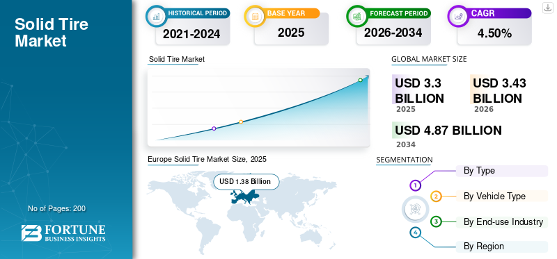 The global solid tire market size was valued at USD 3.30 billion in 2025 and is projected to grow from USD 3.43 billion in 2026 to USD 4.87 billion by 2034, exhibiting a CAGR of 4.50% during the forecast period. Europe dominated the global market with a share of 41.78% in 2025.