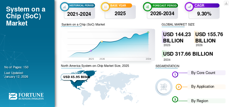 The global system-on-chip market size was valued at USD 144.23 billion in 2025. and is projected to grow from USD 155.76 billion in 2026 to USD 317.66 billion by 2034, exhibiting a CAGR of 9.30% during the forecast period.