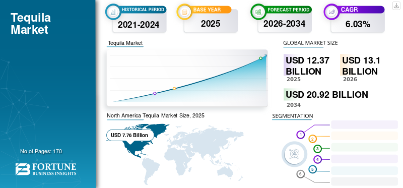 The global tequila market size was valued at USD 12.37 billion in 2025 and is projected to grow from USD 13.1 billion in 2026 to USD 20.92 billion by 2034, exhibiting a CAGR of 6.03% during the forecast period. North America dominated the tequila market with a market share of 62.69% in 2025. Moreover, the tequila market size in the U.S. is projected to grow significantly, reaching an estimated value of USD 7.44 billion by 2032, driven by evolving consumer taste and their growing inclination towards agave-based spirits.