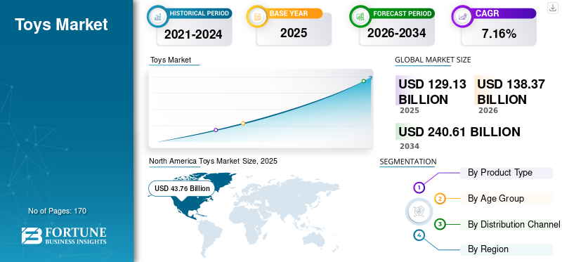 The global toys market size is valued at USD 138.37 billion in 2026, projected to reach USD 240.61 billion by 2034 at a CAGR of 7.16% during 2026–2034. North America dominated the toys market with a market share of 33.80% in 2025. Moreover, the toys market in the U.S. is expected to grow significantly, reaching USD 81.32 billion by 2032. Increasing consumer spending on educational, interactive, and licensed toys is fueling market expansion.