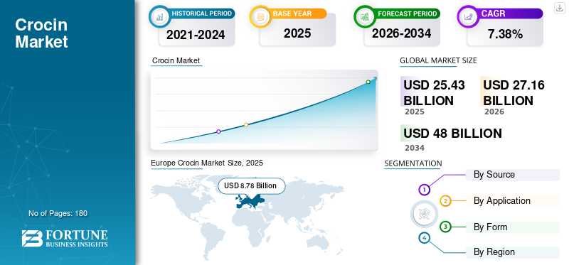 2025年,全球藏红花素市场规模为254.3亿美元。预计该市场将从2026年的271.6亿美元增长到2034年的480.0亿美元,预测期内复合年增长率为7.38%。欧洲在全球藏红花素市场占据主导地位,2025年市场份额为34.52%。